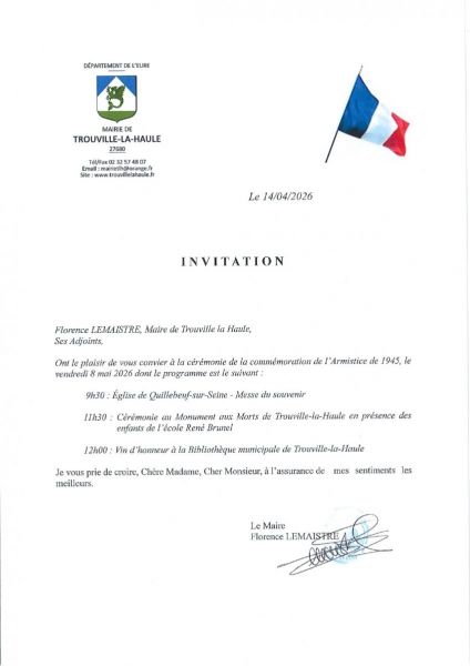 Florence Lemaistre, Maire de Trouville-la-Haule et ses adjoints ont le plaisir de vous convier à la cérémonie de commémoration de l'Armistice 1945, le vendredi 8 mai dont le programme est: